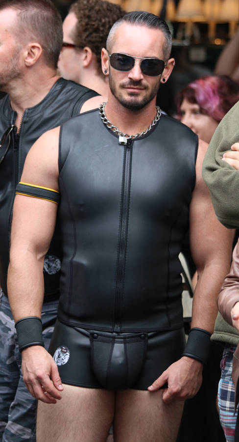 There has been a lot of discussion about the lack of leather at the Folsom Street Fair, but as I look through my photos there are still plenty of men wearing leather. Of course the street fair is about celebrating fetishes and kinks, no matter what they may be. It seems that the definition of what is kinky or a fetish has grown to include many more including sports gear, rubber and neoprene, furry costumes, cosplay and so on. There were a number of drag queens walking the fair and they seemed to garner the most attention at times. There were several that were amazing! Kink.com drew large crowds to their performances of BDSM as did Mr S Leather. The wrestlers were another favorite, as hot, sweaty guys grappled with each other and invited audience participation. Wrestling singlets have become very popular as fetish wear, so it was often hard to tell who was into wrestling and who just liked the look.