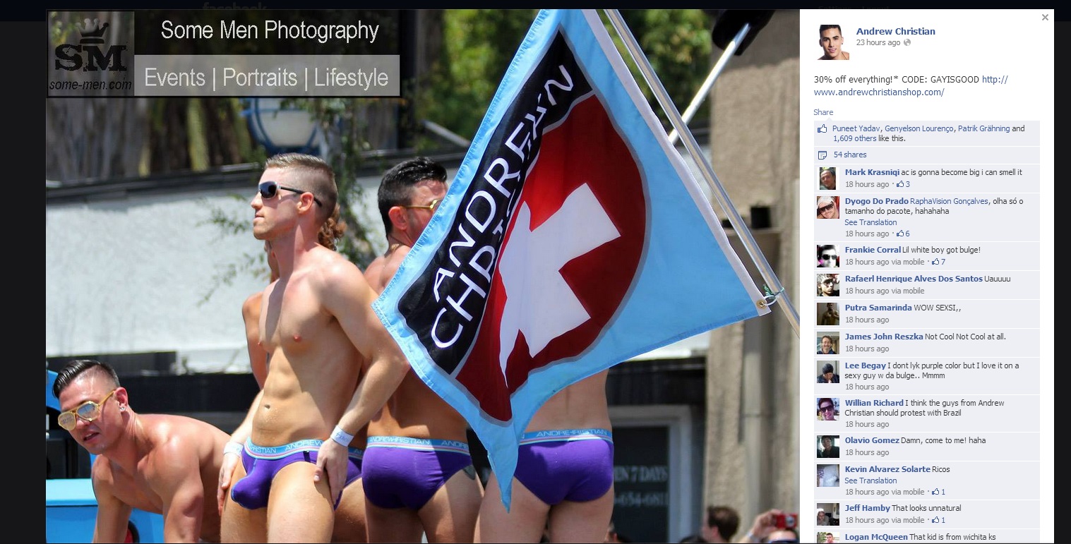Andrew Christian used a few of my photos on their Facebook page! Here are some screen grabs showing the sexy models at LA PRIDE. You can see all my photos from LA PRIDE in the article below this one.